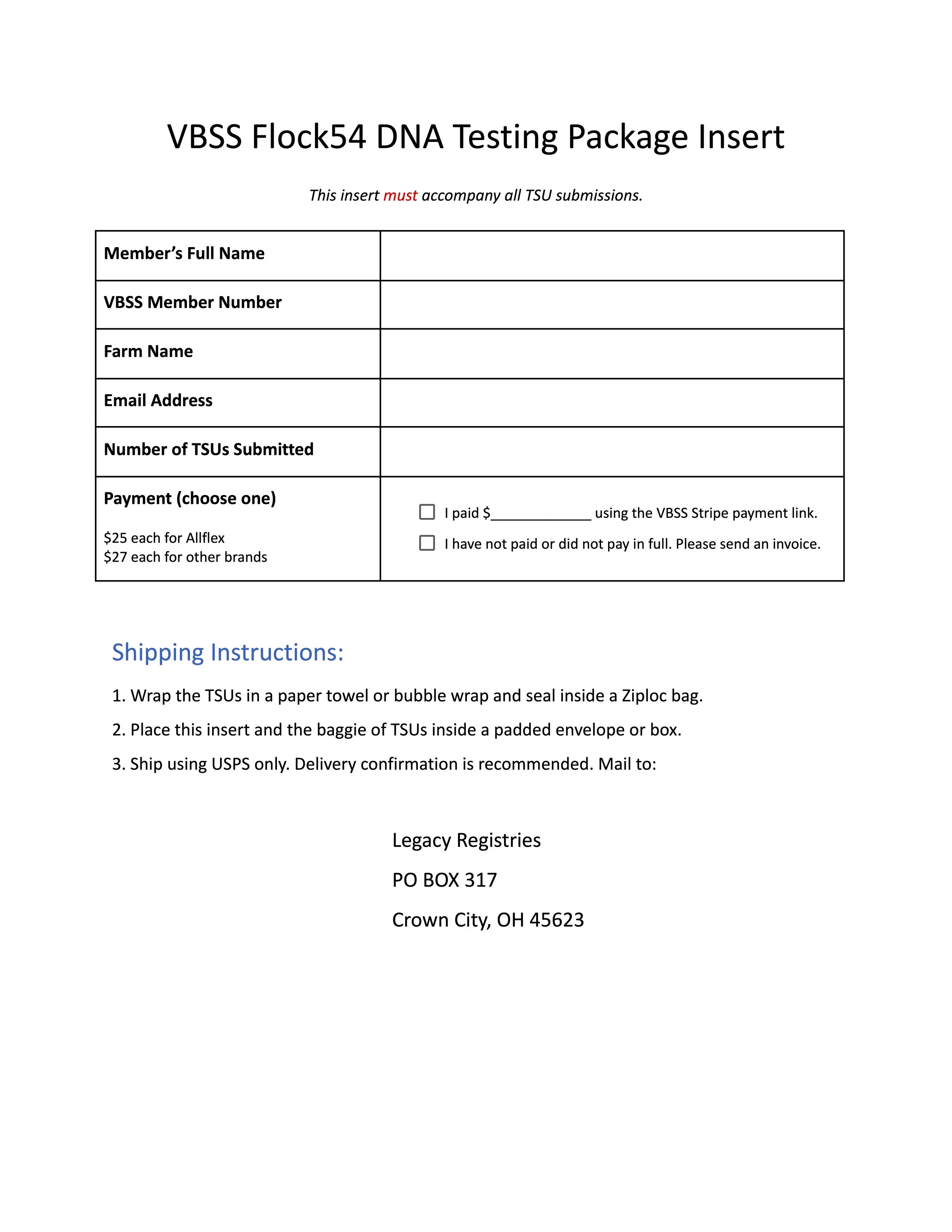 Include the DNA Testing Package Insert with your Producer Info: Full name, farm name, member # and total # of samples included.